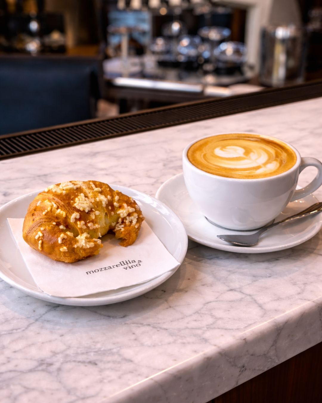 Mozzarella & Vino follows this tradition by serving Italian coffee and classic breakfast pastries during weekday morning hours, reflecting the experience of a neighborhood café in Italy.