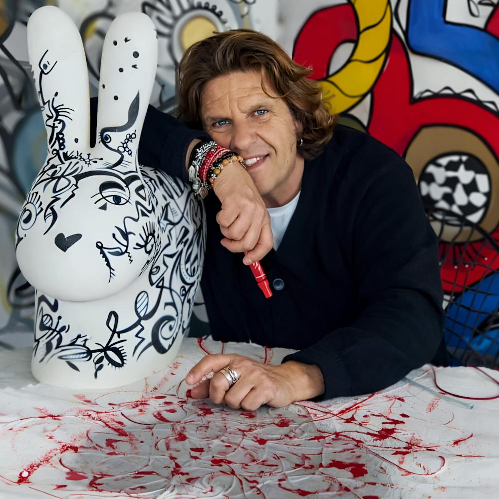 Bold colors, fluid lines, and recurring heart motifs define his work, where emotion and movement unfold freely, inviting each viewer into their own interpretation.